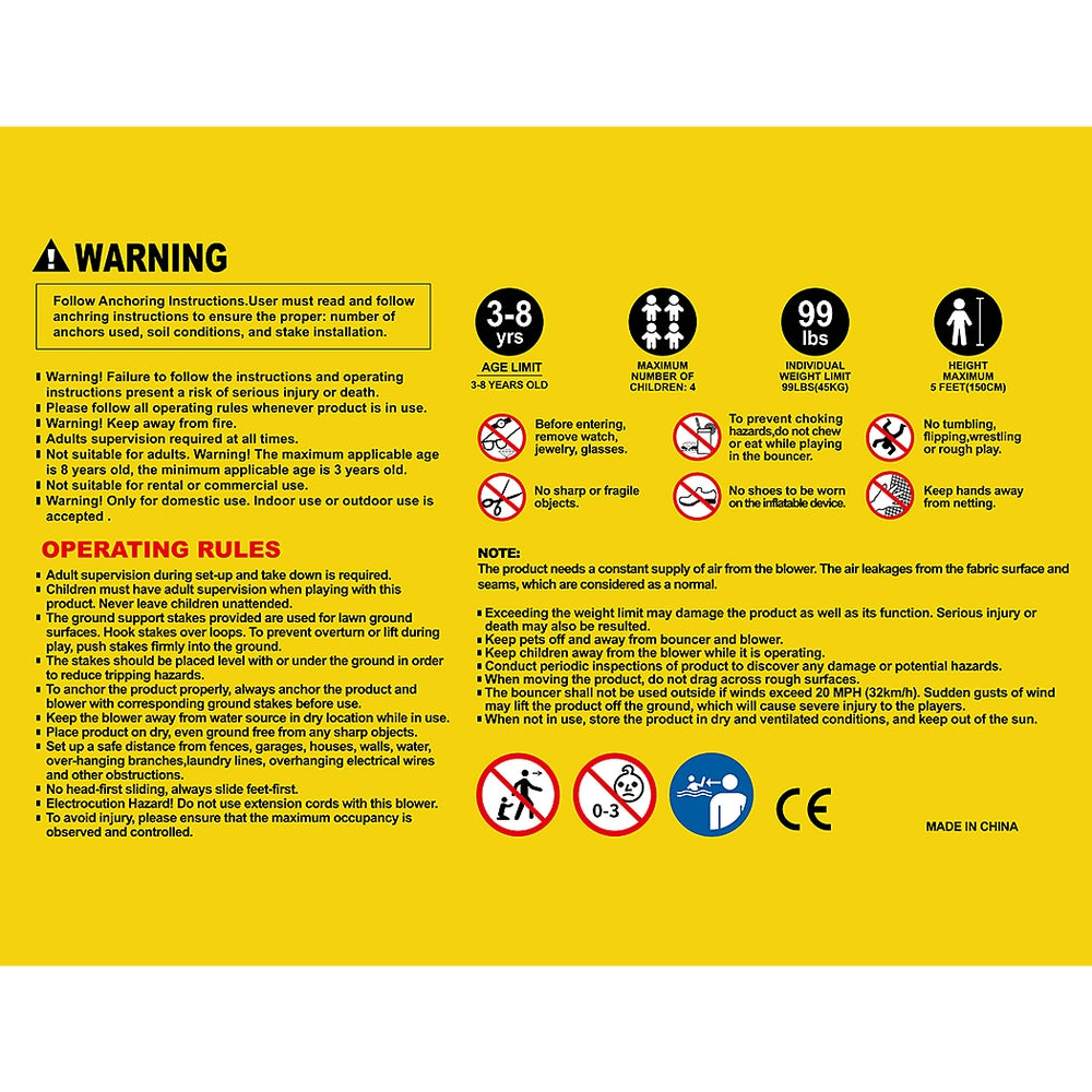 2. Do not set up in windy or rainy conditions: sudden gusts of wind may lift the product off the ground.