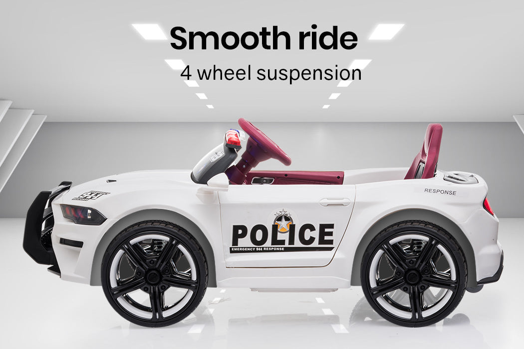 The Mustang Style Police Car features soft start which provides sensible acceleration. A 12V battery and twin motors offer unmatched range. The large wheels sport a rubber grip to stick to slippery surfaces and features a suspension to absorb harsh terrain.