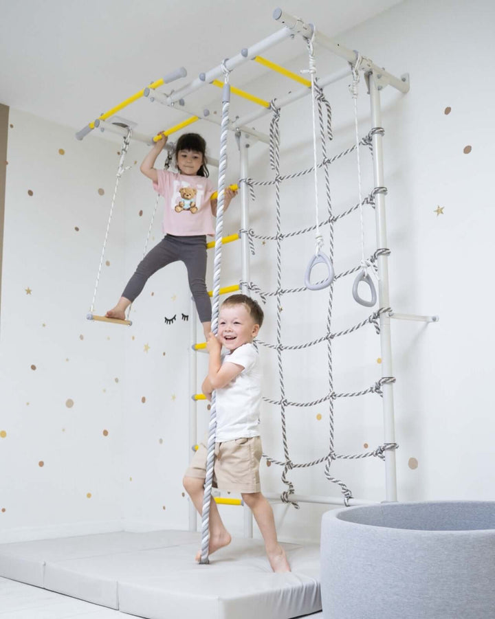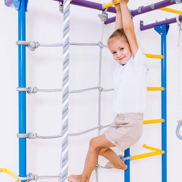 Swedish Giant Wallbars - S7 play gym is a home play gym with Monkey bars, Trapeze, Sensory ladder and more. S7 home playground will help your kids to stay active and happy on rainy days, snowy days, and days when it's just too hot to play outside or when you want to reduce screen time and promote active play at home. These indoor playground equipment are great for burning off kids' energy while developing your kid's gross motor and balance skills.