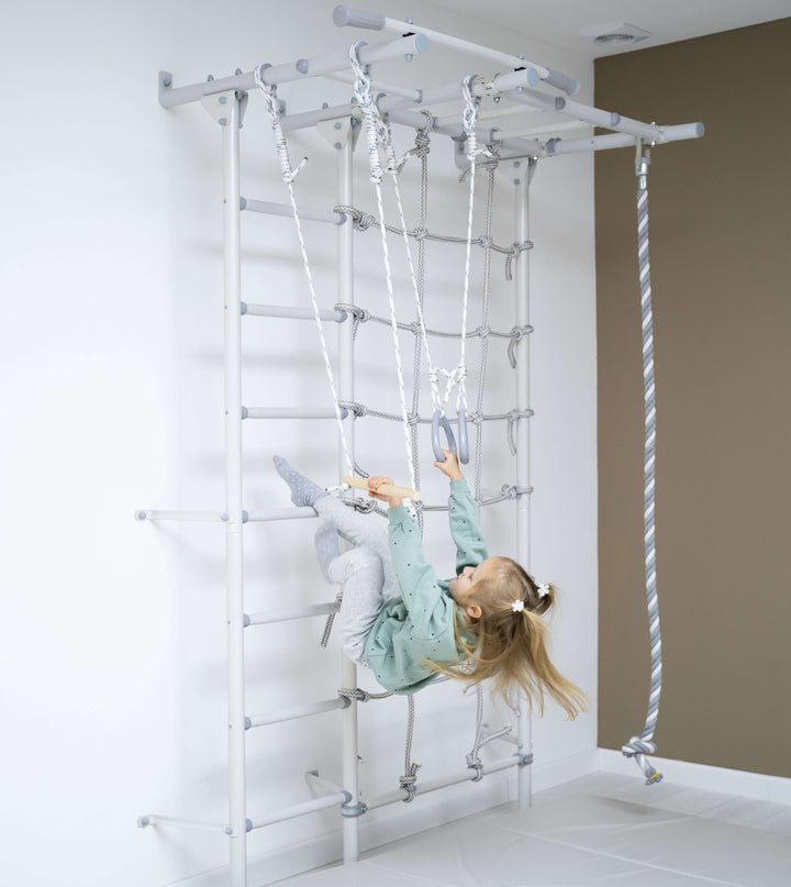 Swedish Giant Wallbars - S7 playset has everything your young adventurer needs to explore and challenge their abilities. It incorporates a spider net, monkey bars, a pair of gymnastics rings, and more, making it a perfect place to spend time on a rainy day for children both young and old. You can further expand by adding an additional accessory of Monkey Bars.